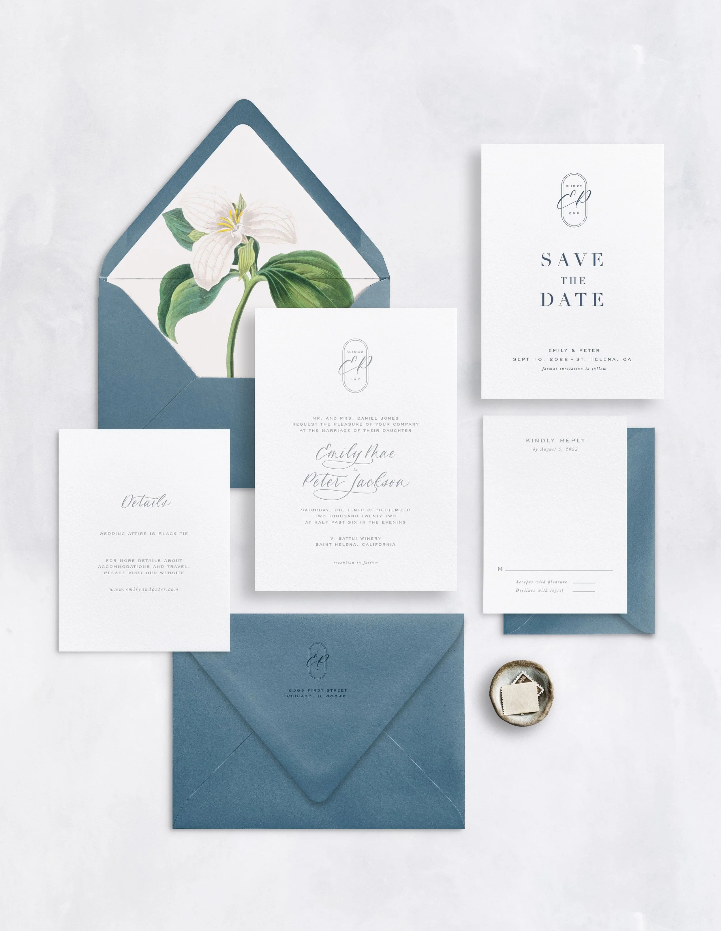 4 piece suite: Invitation & envelope, Reply Card & envelope